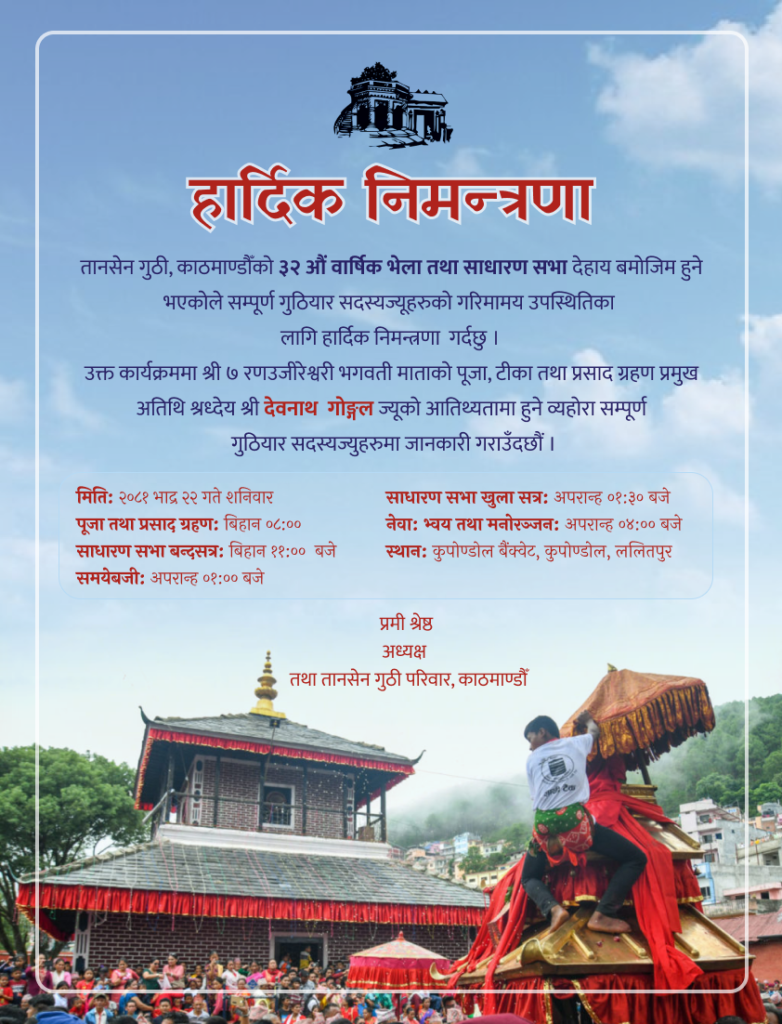 तानसेन गुठी, काठमाण्डौँको ३२ औं वार्षिक भेला तथा साधारण सभा देहाय बमोजिम हुने भएकोले सम्पूर्ण गुठियार सदस्यज्यूहरुको गरिमामय उपस्थितिका लागि हार्दिक निमन्त्रणा गर्दछु ।